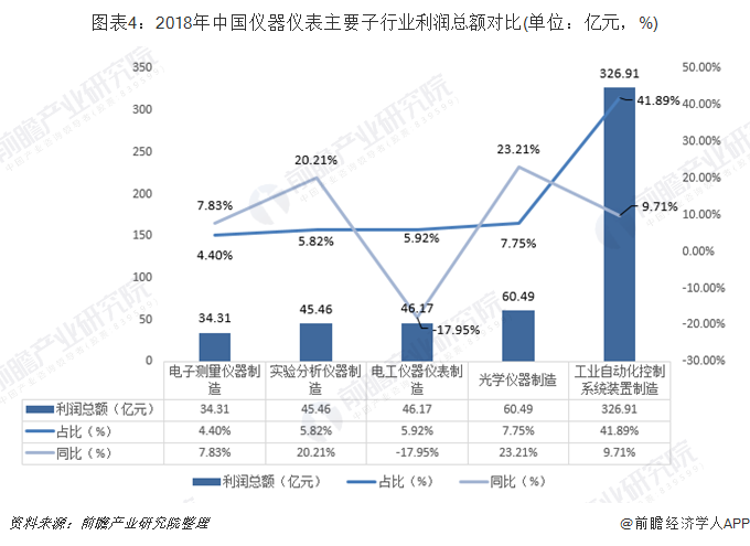 2018年儀器儀表子行業中主營收入排名第一的子行業是工業自動化控制系統裝置制造,實現利潤總額326.91億元,同比增長9.71%。光學儀器制造、電工儀器儀表制造、實驗分析儀器制造和電子測量儀器制造分別排名二至五位,利潤總額分別為60.49億元、46.17億元、45.46億元和34.31億元。