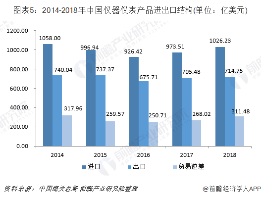 從下圖可以看出,我國儀器儀表產品長期處于進出口貿易逆差的狀態,2018年我國進口儀器儀表產品金額達到1026.23億美元,出口金額714.75億美元,貿易逆差繼續擴大至311.48億美元。